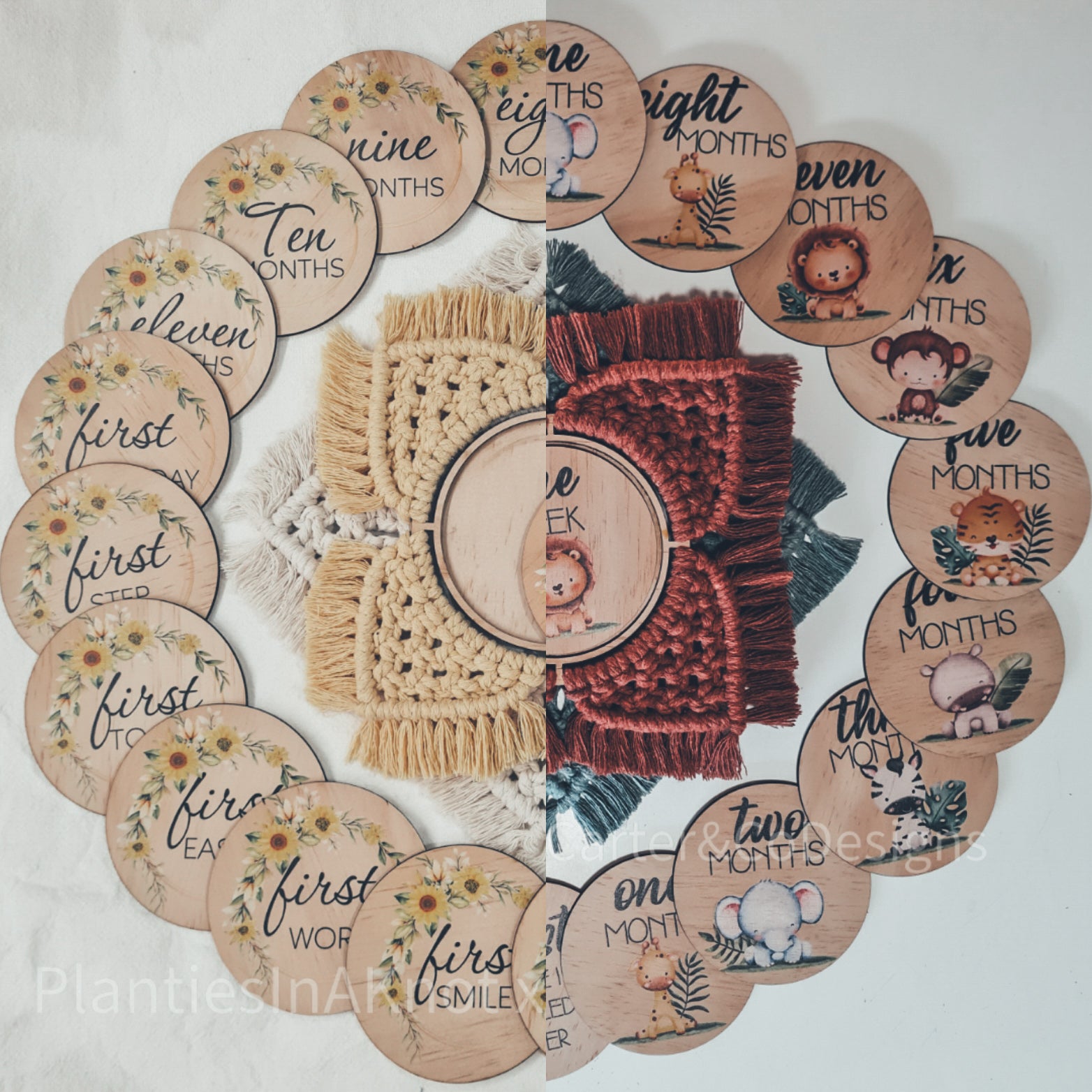 Looking for a completely unique milestone option? Look no further then our macrame flower & milestone sets. You pick the cotton colour and a matching set of timber discs. Swap out the milestone disc each month. In between use the flower to display a candle.