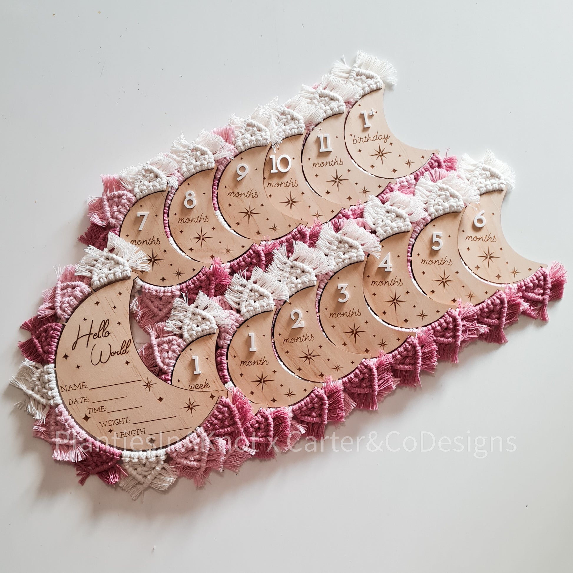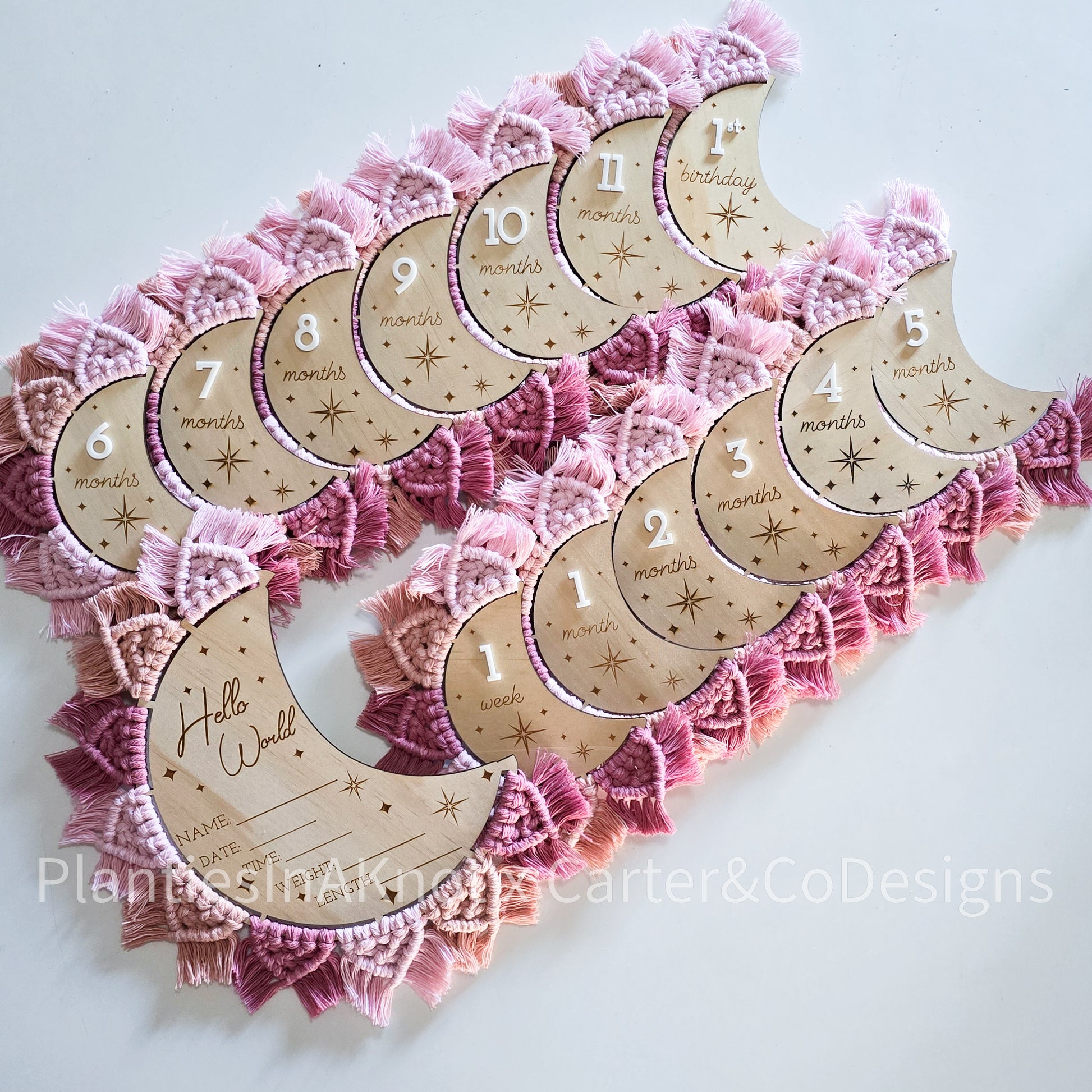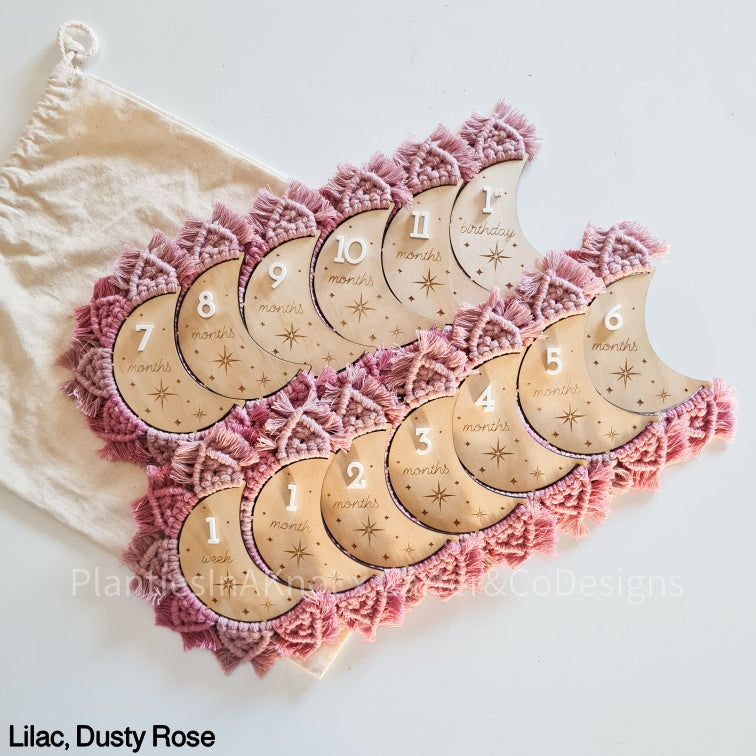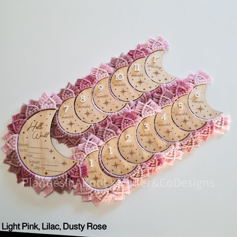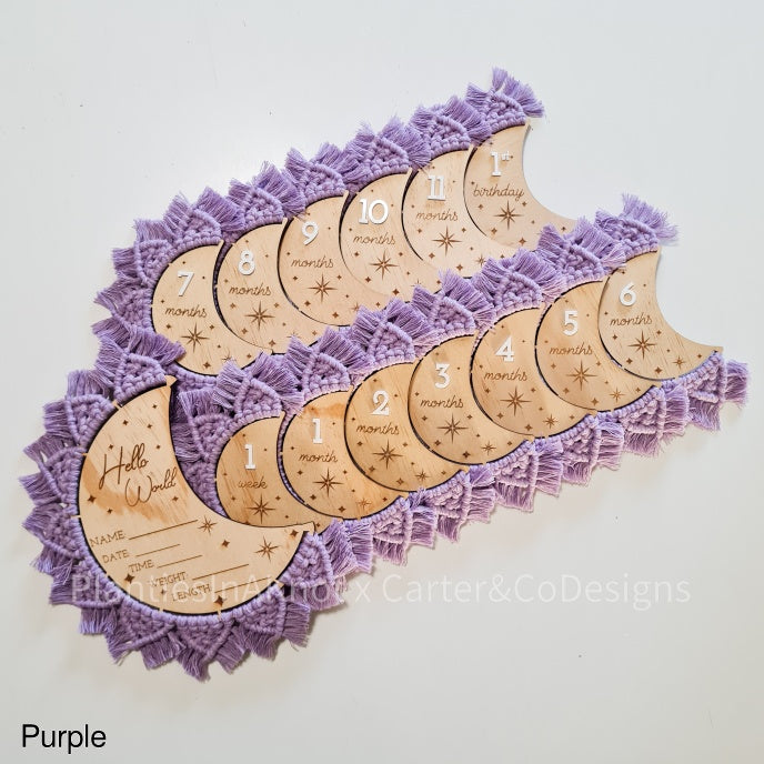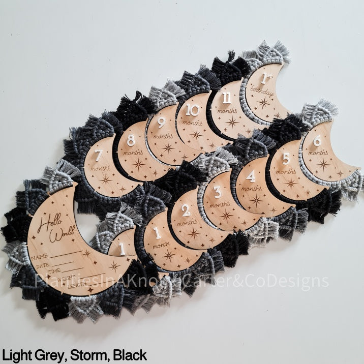 Capture your baby's milestones with our hand-knotted moons. These discs feature an engraved star design, a 3d acrylic number, and the unique feature of the macrame design and fringe. These discs are perfect for taking pictures of your little one. With each disc representing a different month, you can easily track your baby's growth for their first year.