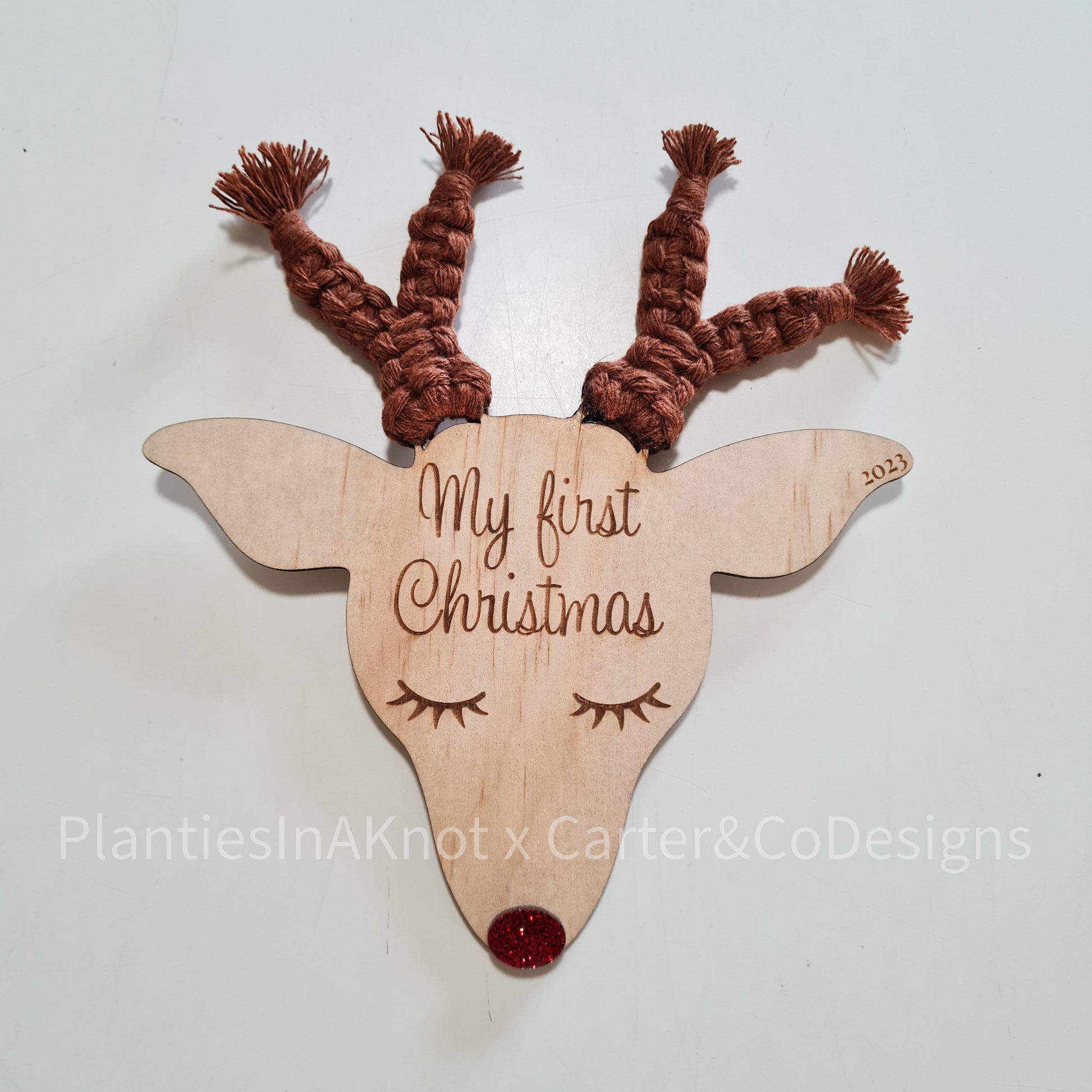 In collaboration with Carter & Co Designs, we bring you this super adorable milestone disc. Macrame Antlers and a cute sparkly red nose make this the sweetest way to capture your bubs First Christmas.