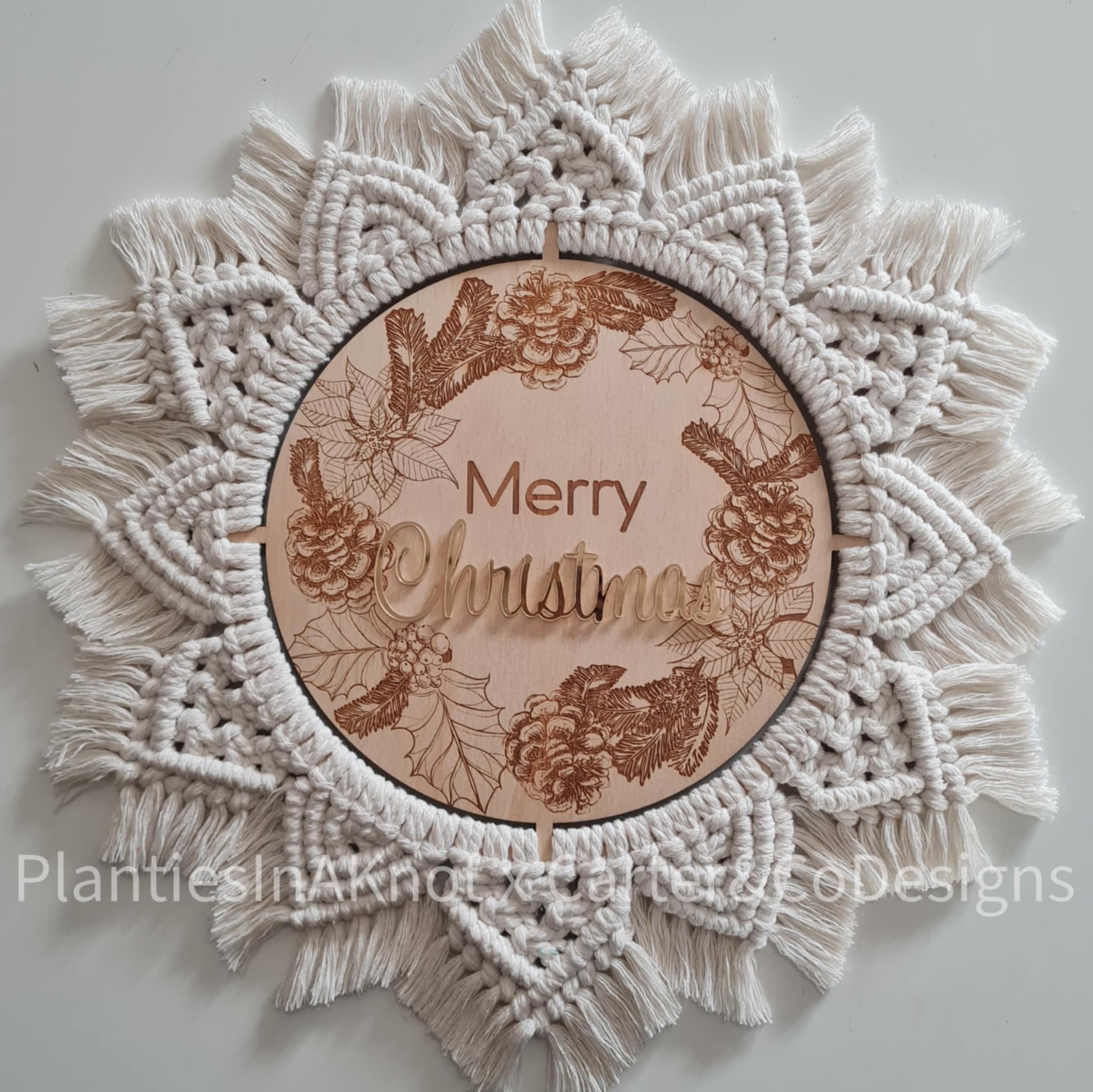 The image is engraved into the timber And the word 'Christmas' is made in Yellow Gold Mirrored Acrylic. The macrame is then knotted onto the timber.