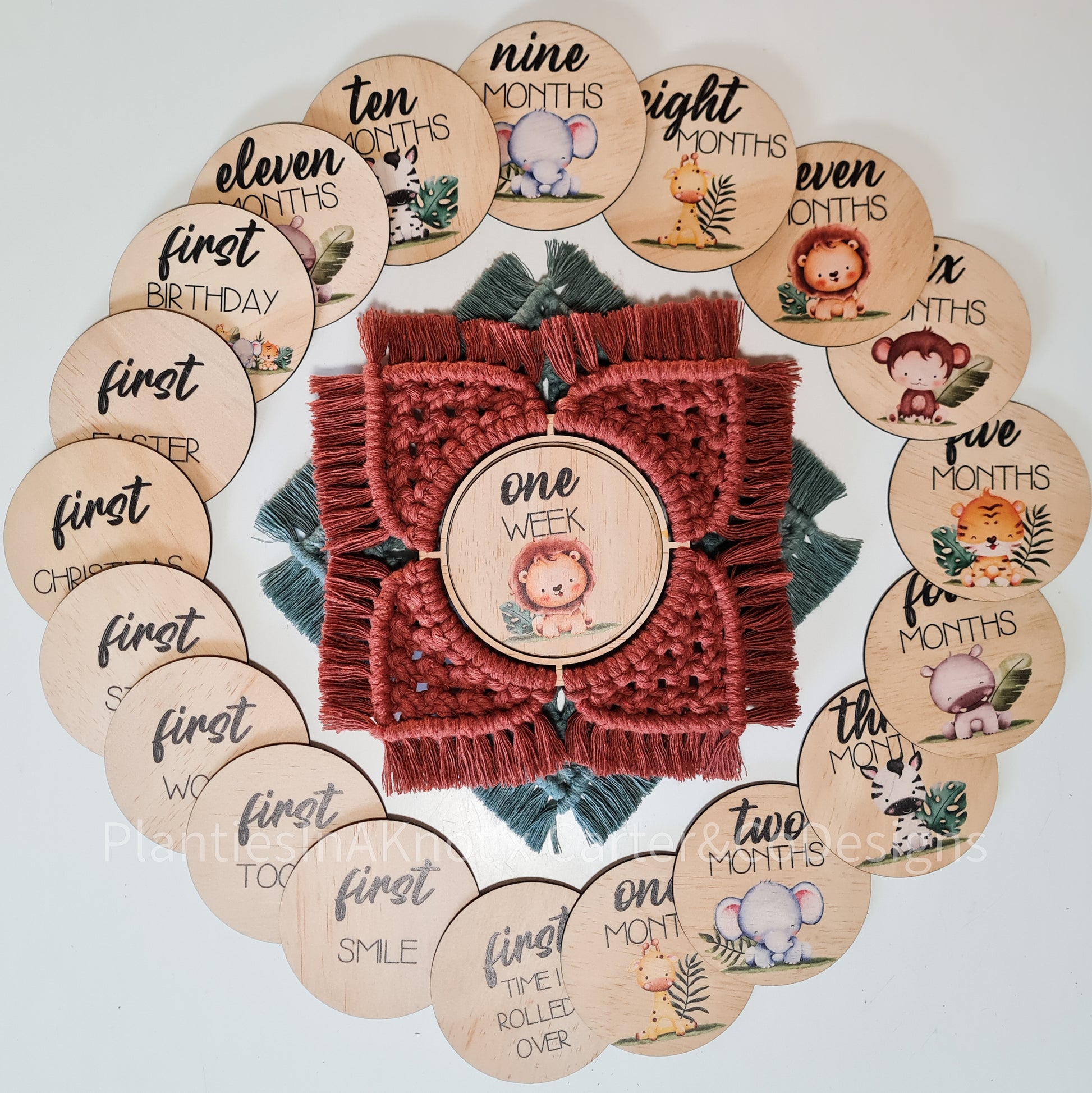 This super adorable safari milestone set is paired with our flower in matching colours, Rust & Lagoon. Swap your discs in and out each month, to make your little ones photos super unique and creative.